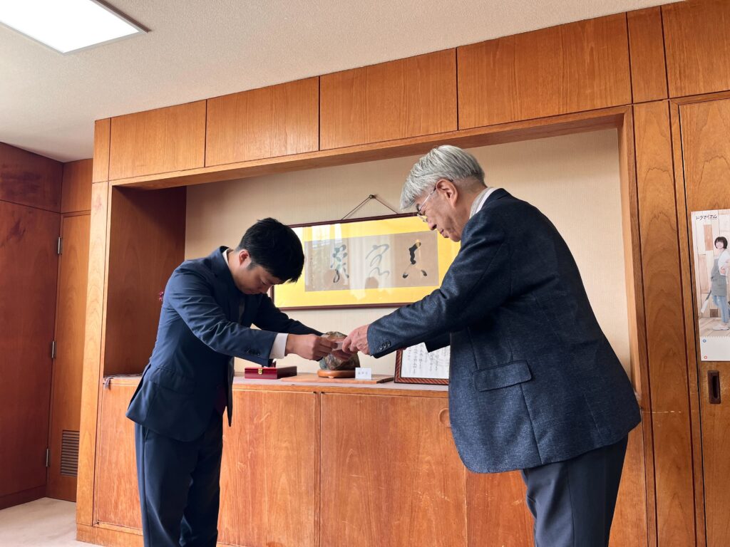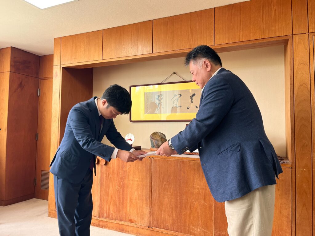 令和11年4月に予定されている新潟県央工業高校との統合に向けて、2025年8月29日に滝沢亮三条市長を訪問し、新たな高校が地域産業の発展に貢献する人材を育成できるよう、新潟県央工業高校同窓会の松縄嘉会長とともに要望書を三条市長に手渡しました。
